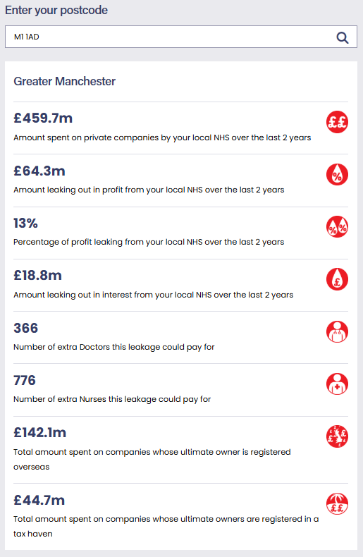 Enter your postcode to discover how much money meant for NHS care is leaking out as profit in your local area.